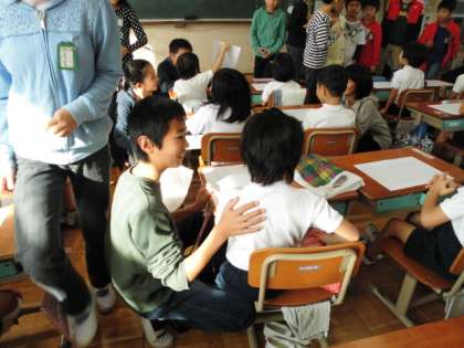 教室に入るとまずは全体にむけて学習発表会の感想を、そして自分のペアの子に感想を伝えてあげていました。