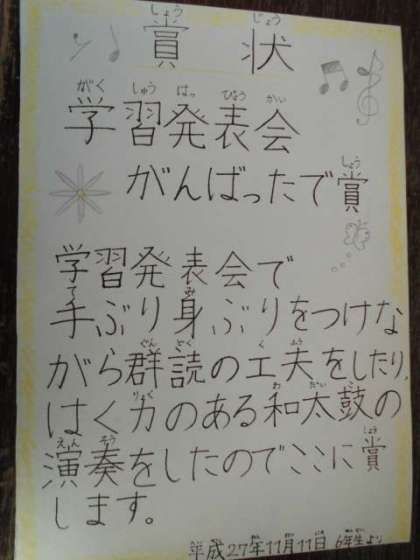 これまた聞くことろによると6年生の子どもたちが自発的に1年生に何かできることはないか一生懸命に考えてくれて、賞状を作って渡そう!となったようです。