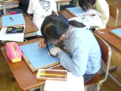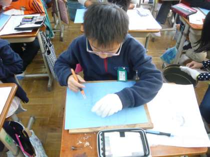 図画工作科では,色版画をすることになりました。自分の輝いている姿を絵にあらわし,それを版木に写し,彫刻刀で線彫りをしています。安全に気を付けながら,自分らしい作品を制作していきます。