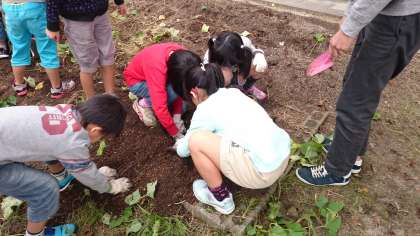 学校の畑に植えていた「さつまいも」を収穫しました。少し土の上に顔を出しているサツマイモを見て子どもたちは大興奮。