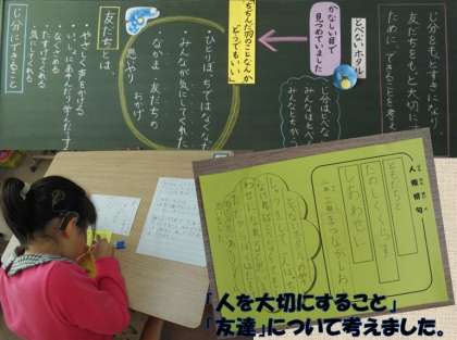 人権朝会で,校長先生から「人権」とは何なのか,自分も友達も大切にするとはどうすることなのかについて考えるきっかけとなるお話をしていただき,またその後,「とべないホタル」の読み聞かせを聞くなどし,「人を大切にすること」,「友達とはどういうものなのか」について考えました。
