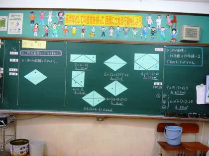 算数科では,図形の面積を求める学習を進めています。今回はひし形の面積を工夫して求める学習でした。小さな三角形を切り取って移動し,長方形にしてから求める方法や,三角形に分けて計算して求める方法,外側に大きな長方形があるとして,その半分の面積を求める方法などが子どもたちの意見から出てきました。最終的には,