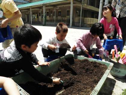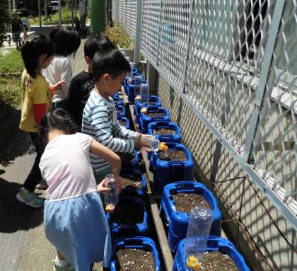 今週は雨の多い週となりましたが,やっとお日様がまぶしい晴れの日となった今日!生活科の学習で「あさがお」の種を植えました。「あさがお」の赤ちゃんが眠っている種をふかふかの土のベッドの中にそっと植えました。みんな,やさしく土をかけ,「おおきくなあれ〜。」と,水をたっぷりやりました。これからの成長の様子が楽しみです。