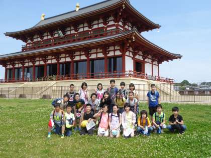 5月20日に,奈良方面へ社会見学に行きました。平城駅から前方後円墳の間を抜け,平城宮跡に到着しました。