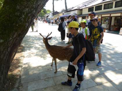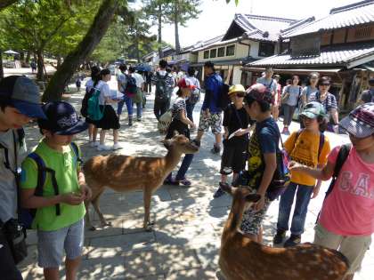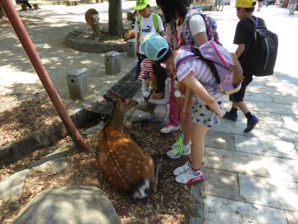 猿沢池から東大寺までの間をグループで回りました。興福寺や春日大社などの寺院だけではなく,たくさんの鹿に,子どもたちは興味津々でした。