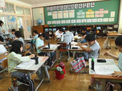 あじさいの花がきれいに咲く季節になりました。図工の時間にあじさいの絵を描きました。墨で輪郭を描き,絵の具で着色しました。最後には画家の方のはんこ風に朱で名前を書き入れました。それぞれに趣のある作品に仕上がりました。