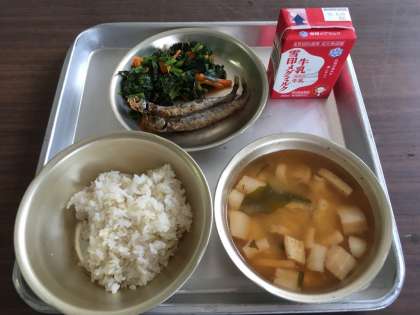 今日の給食は,むぎごはん,みそしる,ししゃものからあげ,ほうれんそうのいためもの,牛乳でした。