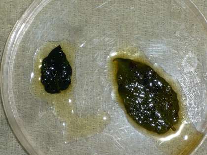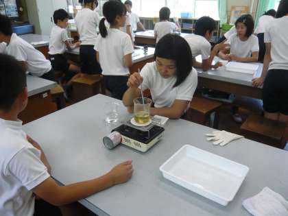 理科では,植物の葉に日光が当たるとデンプンができるのかどうかを実験をしながら確かめています。今回は前日の夕方にアルミホイルをかぶせて準備しておいたジャガイモの葉を「アルミホイルをかぶせたままのもの」と「朝にアルミホイルをはずして午前中たっぷり日光を当てたもの」の2種類に分けました。それぞれをしばらくお湯で煮てから水で洗い,ヨウ素液をかけてみると,日光を当てた方にはたくさんのデンプンができていることが分かりました。