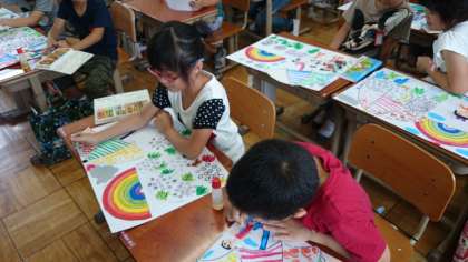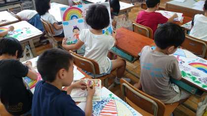 昨日は雨が降ったので,校区探検に行くことが出来ませんでした。時間割りを変更して図工をしました。雨降りの日でも楽しくなるように,「楽しい雨降り」の様子を考えて絵にしました。雨降りで校区探検に行くことが出来ませんでしたが,楽しく学習出来ました。