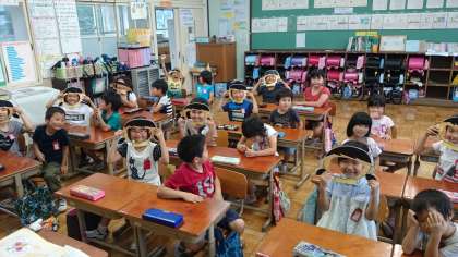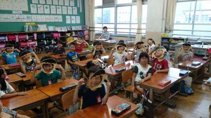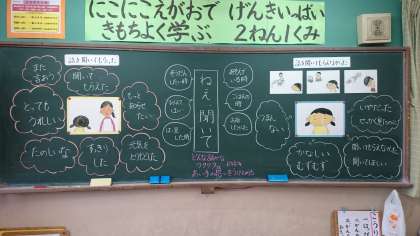 道徳の時間に「ねえ,聞いて」という学習をしました。話を聞いてもらえたときの嬉しい気持ちを改めて実感する学習です。お面を使って,登場人物の夏子の気持ちを表情や言葉で表しました。お面から顔を出して楽しく夏子の気持ちを考えることが出来ました。子どもたちは,聞くってやっぱり大切だし,これからは相手の気持ちを考えて聞きたいと感想を持っていました