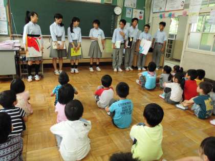 1年生の子どもたちは,初めて会うお兄さんやお姉さんに,最初は緊張気味で,ぽかーんとしている表情が見られ静かな中で自己紹介が進みました。中学生が6〜7冊のたくさんの絵本を読み聞かせしてくれる中で,「次,どうなると思う?」などと対話しながら進めたり,絵本の動作に合わせて,ジャンプする動作を入れたりすると,子どもたちも徐々に緊張がほぐれて,笑い声も聞こえてきました。