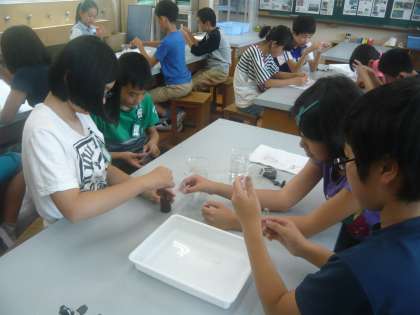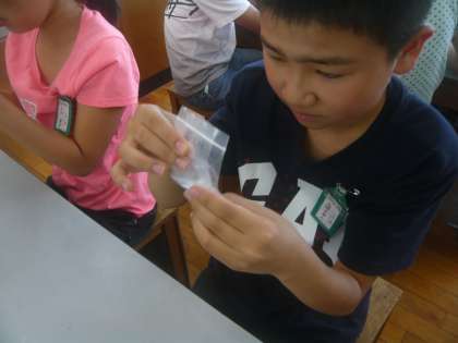 理科では,人の体のつくりとはたらきの学習をしています。今回は唾液の働きについて実験をして調べました。ご飯を小さな袋に入れ,だ液を入れた袋と水を入れた袋の2種類を準備しました。その袋を40度くらいのお湯に入れてしばらく待ち,その後にヨウ素液を入れて反応を調べました。すると,だ液を入れた方の袋は色が変わらず,水を入れた方の袋は青紫色に変わりました。だ液にはデンプンを分解する働きがあることが分かりました。
