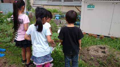 前はプールでやごやマツモムシを見つけました。今回は,水の生き物ではなく,土や草のところにいる生き物を探しました。チョウチョを見つけ,必死で捕まえようとしています。なんとか捕まえることができて大喜び。最後はみんなで見送りながら,教室の窓から外に放しました。