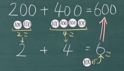 みんな答えをスッと求めます。百円玉は見慣れたものなので,イメージしやすいのでしょう。どのように計算したかを問われると,2+4=6をして00をつけましたという説明をしていました。計算のスキルとしてはあっていますが,どうして2+4なのか,そして00をつけると答えになるのはどうしてなのかということに関しては不十分です。