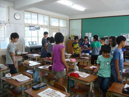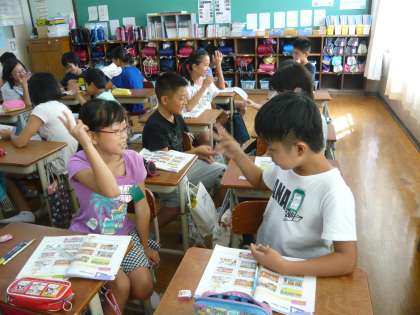 外国語の学習で,「Turn right」の単元の学習をしています。今回は英語で道案内をしました。初めはテキストを使って,その中で道案内をしましたが,後半は自分たちでペアになって教室の中を英語で案内しました。慣れない表現でしたが,使っていく中で少しずつ上達していきました。