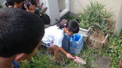 バッタやコオロギ,土の中からは幼虫が出てきて,いつの間にやら「生き物探し」の学習になりました。