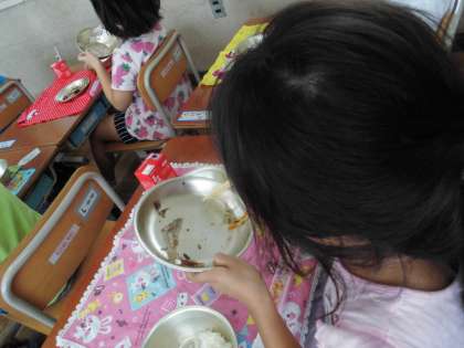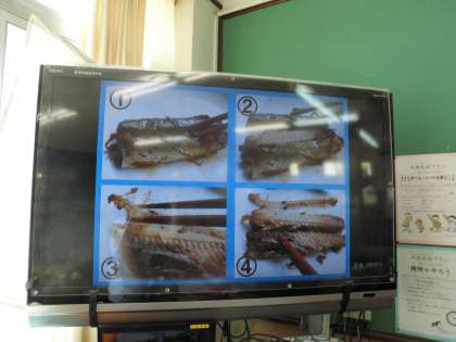 今日の給食は,「さんまのしょうが煮」でした。久しぶりの煮魚を一生懸命食べていました。教室のテレビには,さんまの骨の取り方や食べ方を説明した画像を映しています。子どもたちは,お箸を上手に使って骨をとり,口に入る大きさに取り分けて食べていました。やわらかく煮てもらっているので骨まで食べられるのですが,どうしても骨が気になり,なかなか食べ進められない子どももいます。それでも,骨を一生懸命取り除きながら食べている1年生でした。