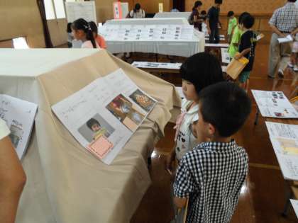 土曜学習の後に,自由研究鑑賞教室がありました。全学年の自由研究を見て回り「素敵だな。」と思う作品を探しました。1年生はまだ漢字が読めないので選ぶのは難しいようですが,友達やお兄さんお姉さんの作品を丁寧に見て回っていました。中には,自分の作品を説明している子どももいました。