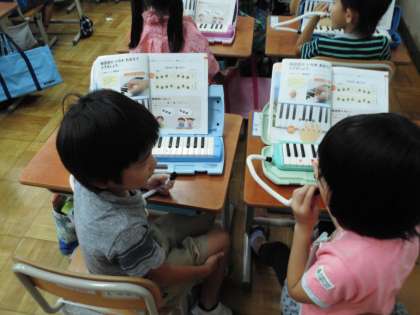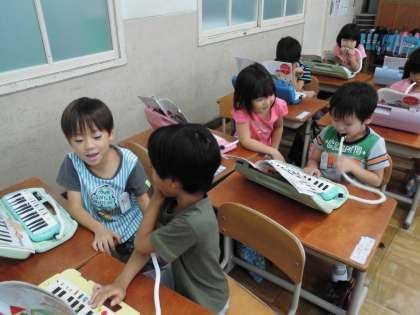 音楽科「どれみで うたったり ふいたりしよう」で鍵盤ハーモニカの学習をしています。夏休みの間に「どれみで あいさつ」を練習してきていたので,成果が出ています。今日は,「どれみ」をつかってまねっこをしました。こちらが「どれみ」と言うと子どもたちが「どれみ」と演奏します。「みどみ」と言うと「みどみ」と演奏します。「どれみ」の3音だけでいろいろ言いながらまねっこができました。次は,お隣の友達とペア学習です。1人が「どみみ」と言うともう1人が「どみみ」と演奏します。友達と一緒に楽しくまねっこができた音楽でした。
