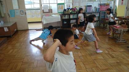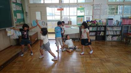 この遊びは大人は楽しむのはなかなか難しいかもしれませんが,そこはさすがは子どもたちです。動いて止まるという単純な動作の中に色々な楽しみを見つけちゃうんです。さすがは遊びの達人です。思い思いの動きをして止まる。傾いたり ,片足立ちになったり,体をそらせたり。変な体勢で止まることが嬉しくて楽しくて。後ろで音楽でも流したなら,素敵な創作ダンスが出来上がりそうです。