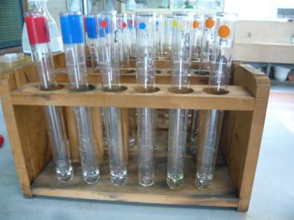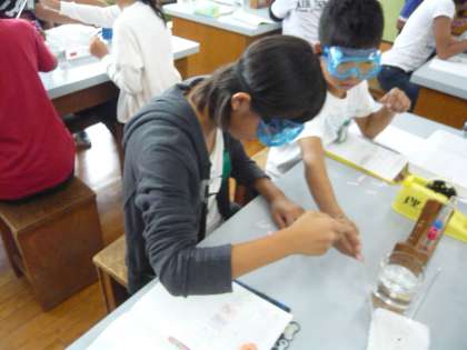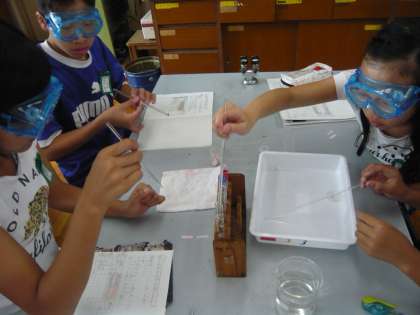 理科の学習では,水溶液の性質について学習しています。今回は塩酸,水酸化ナトリウムの水溶液,酢,炭酸水,石灰水,さとう水の性質について調べました。リトマス紙を使って酸性かアルカリ性か中性かを知ることができました。