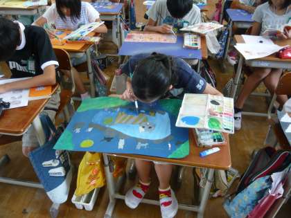 図画工作科では,物語を読んでそれを絵に描き表す学習をしています。4つの物語から自分のお好みのお話を選び,さらにその中からお気に入りの場面の様子を想像して絵に描き表しています。画用紙作りから工夫し,自分だけの作品を創り上げています。