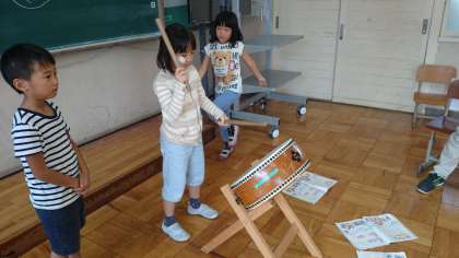 音楽の時間に和太鼓の練習をしました。リズムうちの学習を活かして,おまつりの音楽をつくりました