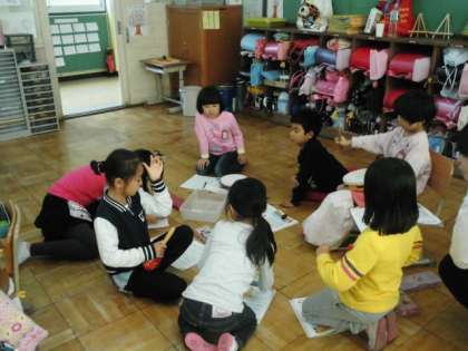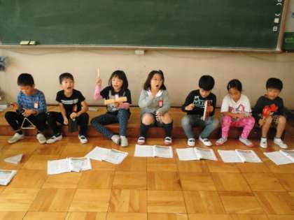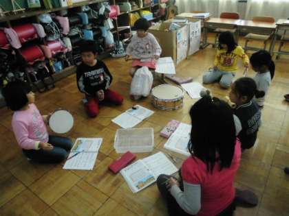 音楽の時間です。「かぼちゃ」という曲に合わせて,いろいろな打楽器を使って,音を重ねます。一人,二人,三人・・・・七人とどんどん人数を増やして,いろんな打楽器の音が重なっていきます。人数が多くなればなるほど音をよく聞いて打楽器を鳴らさないとみんなの音がずれていきます。
