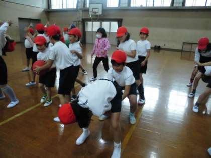 パスをする,パスを受けるゲームもしました。パスしたい相手の名前を呼んでその子にパスをするというゲームです。単純なゲームですが,子どもたちは大喜び。全然ちがうところにパスしてしまったり,パスを後ろに逃してしまったりしながらも何度も繰り返してパスをしていました。2年生はあまりボールで遊ぶことがないので,これを機会にどんどんとボールに慣れて,ボール遊びを増やしていけたらいいなと思います。