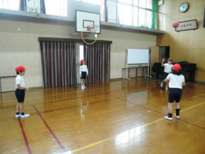 まず,一列になって,ボールを頭の上から渡したり,股の下を通して渡したりして,ボールを両手で扱う練習をしました。ボールを扱うことは案外と難しく,指に力が入りすぎて,はじいてしまったり,滑って落としてしまったりすることもあるので,柔らかくボールを扱えるようにどんどんボールに慣れていけたらと思います。