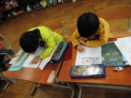 国語科の学習で「じどう車くらべ」の学習をしています。そして,学習をしたことを使って,自分たちでも自動車カードを書き,「じどう車ずかん」をつくる予定をしています。まずは,教科書に出てくる自動車のカードが仕上がりつつあります。