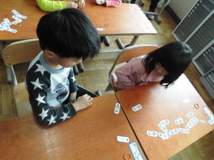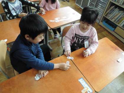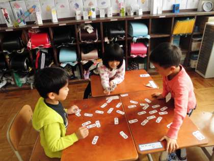 今日は,引き算カードを使って「おおきさくらべ」をしました。2人で一緒にだしたカードの式で答えが小さい方がカードをもらえます。時々,カードの裏の答えをみて,大きさ比べをしているペアがいるので,式だけを見て答えの大小を比べることを伝えます。「ん〜…」と,一生懸命計算している様子が伝わってきました。
