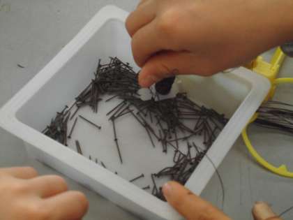 理科で電磁石の学習をしました。初めに電磁石のしくみを知り,自分たちで電磁石を作りました。その後,引き付ける力を強くするためにはどうしたらよいか考えたことを出し合い,実験をしました。コイルの巻き数を増やしたり,電池の数を増やしたりすると引き付ける力が強くなることが分かりました。また,その際に電流計を使って計ると,電磁石に流れる電流が大きくなることも確かめられました。