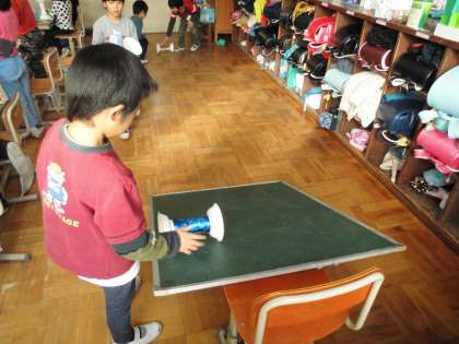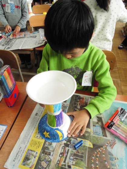 図画工作科で「かみざらコロコロ」の飾りつけをしています。これは,コロコロと動く動きかたや,動く様子から飾りを工夫してつけます。そこで,教室では飾りつけをしながら転がしてみて,転がっている時に飾りがどのように見えるかを確認します。そして,また飾りつけをします。子どもたちは「飾る→試す→飾る」を繰り返しながら学習しています。友達が,効果的な飾りをつけていると,お互いに声を掛け合って「それ,いいね。」と鑑賞し,また自分の作品にも生かすところが見られました。友達と学びあっている姿が見られました。