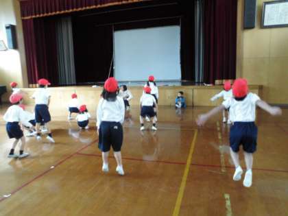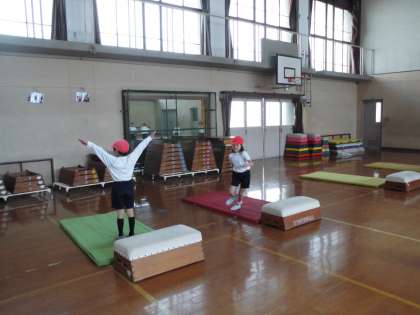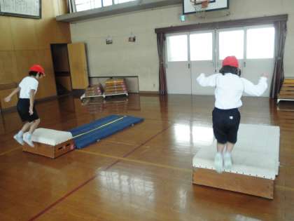 そのあと,「とびばこ」の学習に入りました。初めてのとびばこ学習ですので,まずは準備の際の安全な運び方から学習です。準備が終わると,1段のとびばこに両足ジャンプでとびのる練習をしました。両足一緒にジャンプすることは,意外と難しい様子でした。