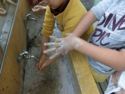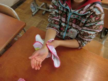 手洗いの予防で大切なことは、「しっかり泡立てた石けんで洗う」ことと「水気をハンカチで拭き取り乾燥させる」ことです。この学習の日でも、ハンカチを忘れている子どもが何人かいました。清潔なハンカチを毎日必ず持たせてくださいね。
