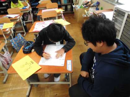 昼休み,残念ながら雨降りのため運動場で遊べません。でも,学生ボランティアの先生二人が自由帳に一緒に絵を描いたり,プリントのお直しをしている子どもの横に付き添って,鉛筆の持ち方を教えたりしてくださっていました。子どもたちは大喜びで先生たちの周りに群がりました。雨降りだったけれどいつもと違う休み時間に満足そうな子どもたちでした。