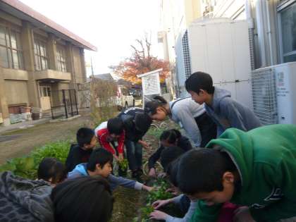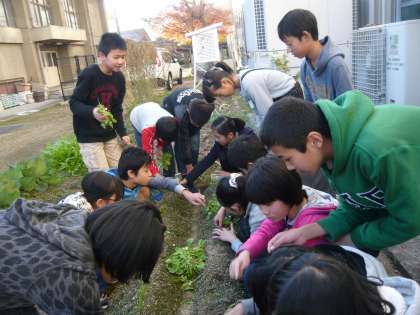 総合的な学習の時間の活動の中で育てている聖護院大根がたくさん芽吹きました。大きく育ってきたのですが,その中でもよく育っているものだけを残して,他の芽を抜きました。大きく成長させるためには仕方のない作業ですが,子どもたちは慎重に作業をしました。