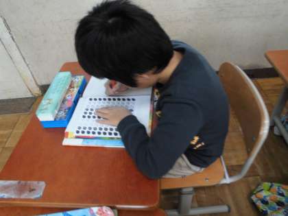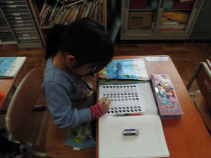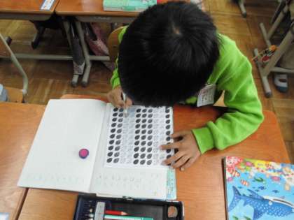 大きい数を学習してきていますが、今日は「100」という数が出てきました。100枚の葉っぱの挿絵を10のまとまりごとにして数え、10が10個で100になることを学びました。続けて100ってどんな数かを考え、「90よりも10大きい数です。」、「99よりも1大きいかずです。」ということを見つけました。