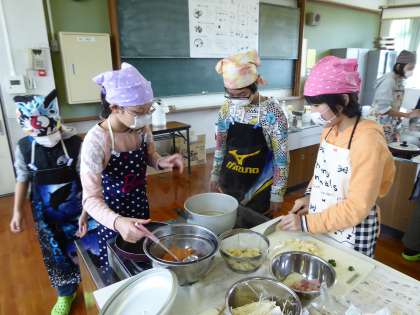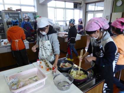 家庭科の学習で,調理実習をしました。今回は「野菜のベーコン巻」と「ジャーマンポテト」を調理しました。野菜の下準備をした後に手際よくベーコンで巻いたり,野菜を切ったり,完成する時刻を意識して炒めたりしました。調理した後は給食の時間においしいカレーと一緒に試食しました。