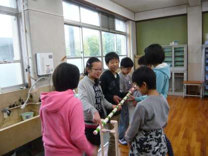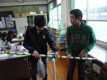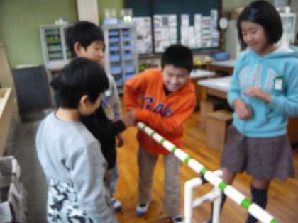 理科では,てこのはたらきの学習をしています。今回は,「力点を変えずに支点から作用点までの長さを変えた時の手ごたえの違い」と「作用点を変えずに支点から力点までの長さを変えた時の手ごたえの違い」を,実験を通して考えました。子どもたちは実験を通してさらに課題を見つけ,実験を自分たちで考えて行い,その課題を解決していきました。