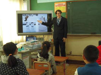今年初めてのコーリー先生による授業は,大雪の日になりました。授業のはじめにはコーリー先生のふるさと,カナダの様子を写真で見せてもらいました。京都でもたくさん積もった雪に大喜びの子どもたちでしたが,カナダの積雪の様子を見て,驚きの声をあげていました。コーリー先生の英語での解説もだいたい理解できたようで,「そんなに雪降るのー?」「そり遊びおもしろそう!」「雪だるまが大きい!」などの声があがりました。