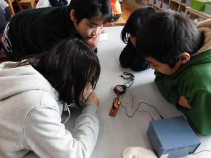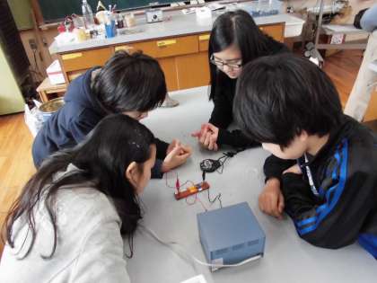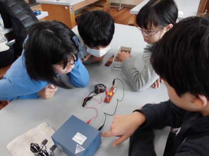 理科では,電気の性質とその利用の学習をしています。今回は,電熱線に電流を流すと発熱することを実験を通して確かめました。電熱線の太さによって,発熱の仕方が変わることも分かりました。