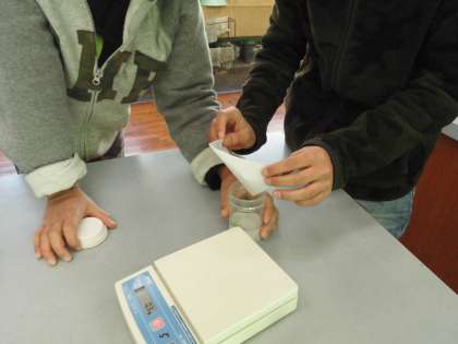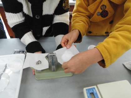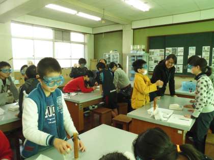 水溶液の学習をしています。塩とホウ酸を使って水にどれだけ溶けるのか実験をしました。水に溶ける量には限りがあることが分かりました。では,もっと多くの量を溶かすにはどうしたらよいか,考えながら実験しました。