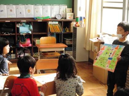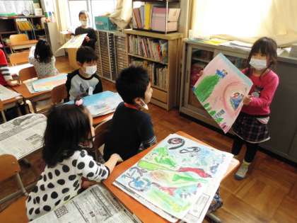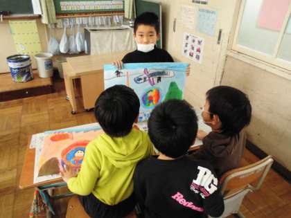図画工作科の「のってみたいな いきたいな」の絵が出来上がりました。自分の絵のお話を考え,「○○にのっている 自分が □□へいって △△をする。」というように紹介しあいました。グループの中で鑑賞し合うとお互いに質問したり感想を言ったりして盛り上がりました。想像を広げる楽しさを味わえた学習でした。