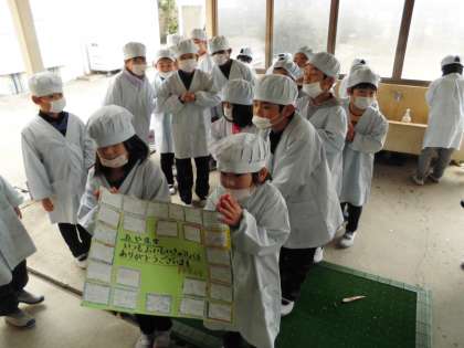 給食調理員さんへ感謝の気持ちをメッセージで伝えることにしました。メッセージには,ありがとうの気持ちと自分の好きな献立を書いたり,食べられるようになった献立を書いたりして,給食当番が届けました。どきどきしていましたが,直接感謝の言葉を言えて,満足そうな1年生でした。