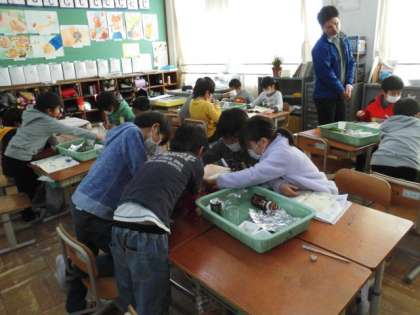 3年生は理科の学習で「豆電球に明かりをつけよう」の単元の学習をしています。2月15日の5・6時間目は,「電気を通すもの」について調べました。身近にあるものに豆電球を使ったテスター(小型回路計)を接続して調べ,「電気を通すものは『金属』」ということを確かめました。