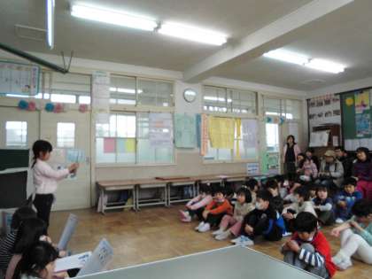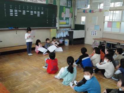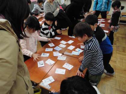 1年生最後の授業参観日。国語科の「いいこといっぱい1年生」より,1年間の思い出を発表しました。そして,みんなで作った思い出カルタを保護者の方と一緒にしました。とっても盛り上がった1年生。