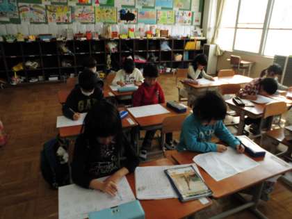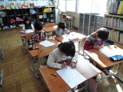 今年度最後の土曜学習がありました。今年度最後ということもあり,たくさんの子どもたちが参加しました。学校では,初めての100マス計算にチャレンジすることにしました。すると,子どもたちからは「やったー。」と歓声が上がりました。丸付けをして,全部正解していると,またまた歓声があがります。ほかにも,「とけい」「大きなかず」「たしざん」「ひきざん」「文章問題」など,1年生の学習の復習をしました。時間いっぱい学んだ子どもたち。力を伸ばした時間でした。
