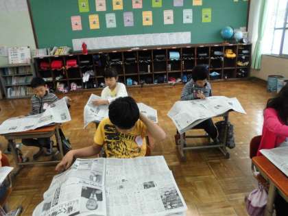 国語で「新聞を読もう」を学習しています。興味のある記事を探して,感想を書きました。「新聞」は難しいというイメージが強いですが,一生懸命読んでいる子どもたちでした。意味や読み方の分からない言葉がありましたが,国語辞典で調べたり,前後の関係から推測したりして読みました。そして,感想を書きました。難しい「新聞」ですが,興味のある記事をきっかけに,「新聞」と子どもとの距離を少しずつ縮めていきたいです。